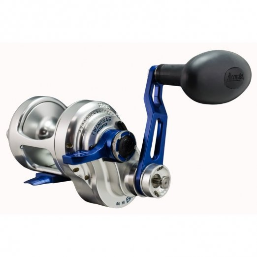 Accurate BX2 Boss Extreme Series II 2-Speed Lever Drag Reels are available in several sizes. They are silver/blue in color.