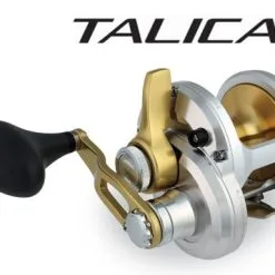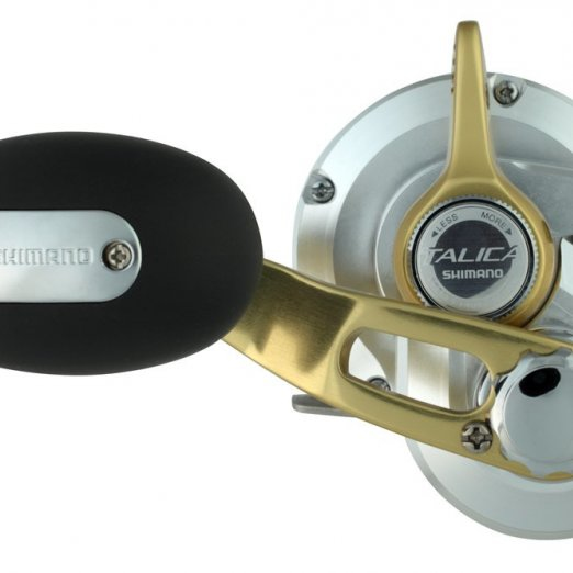 Shimano Talica Single-Speed Lever Drag Reels are available in four sizes. They are silver with gold accents.