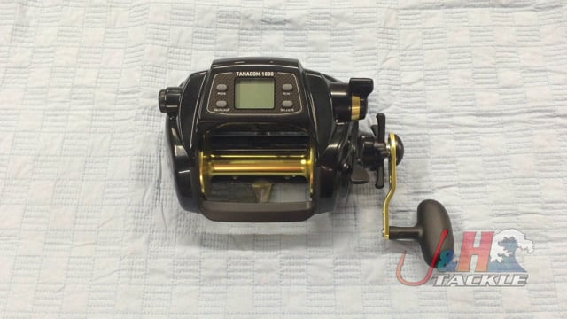 The display on the Daiwa Tanacom 1000 Power Assist Electric Reel reads out in English. Reels are black and gold.