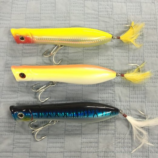 Tsunami Talkin Popper XD Plugs are available in 5″, 6″ and 7″ sizes and six spectacular colors. All of the yellow/golden color plugs have yellow teasers and all the other models have white teasers. All of these plugs float. Buy some Tsunami Popper lures today!