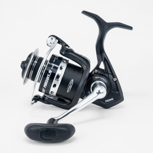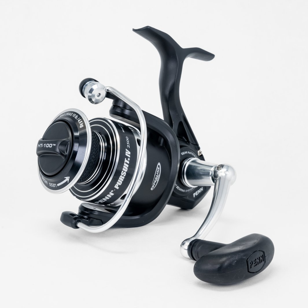 Penn Pursuit IV Spinning Reels are available in six sizes. They can handle both mono and braided fishing lines. All models are black with silver accents.