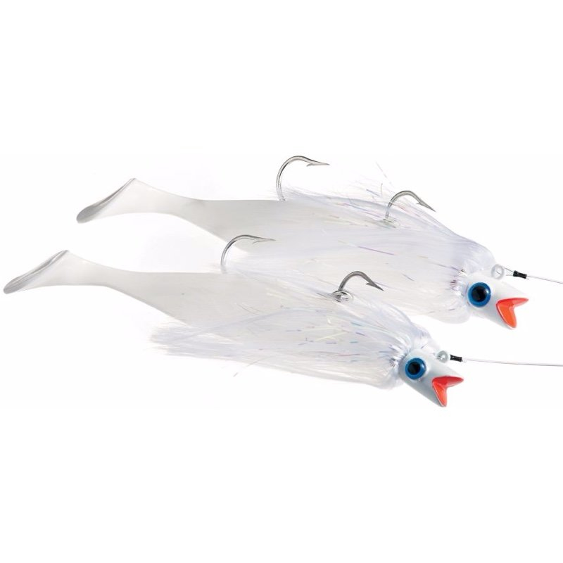 It’s no secret that trolling has become the most deadly effective method in pursuing trophy cow sized bass – however tedious and mundane it may be. Blue Water Candy has thrown their hat in the trolling ring with the wildly popular tandem Mojo rigs, comprised of two heavy jig heads, rigged parachute style, complete with giant 8” rubber shad bodies. These particular lures are a bit more convenient than your traditional umbrella rig or bunker spoon in that you don’t absolutely need a dedicated wire line trolling setup to effectively pull these suckers. The heavy jig-heads provide enough downward force to pull your offering down into the strike zone. You can definitely still run these on wire line outfits with equal effectiveness, but it’ll save you some time and money just using your standard heavy duty striper rod and reel. The rigs are heartily constructed using tuna-caliber hardware and mono, leaving you to only worry about which buddy to brag to. Unlike a standard parachute rig that requires hours of shoulder-wrenching jigging, just set your offering back and pull it like an umbrella rig – and be ready to hear that reel scream!